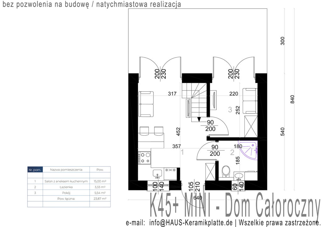 W związku z dużą ilością zapytań odnośnie pełnego zakresu deweloperskiego zawierającego w cenie projekt oraz wszelkie formalności, nadzór realizacyjny, fundamentowanie, konstrukcję, pokrycie dachowe, stolarkę otworową, ocieplenie fasadowe z tynkiem, instalacje w budynku – elektryczną, wodno-kanalizacyjną, wentylację, ogrzewanie, posadzki, docieplenie oraz tynki na sufitach i ścianach, a także odbiór budynku do użytkowania – kompletne ceny realizacyjne zaczynają się od przedziału 5000-6000 zł netto za m² powierzchni pod dachem dla budynków parterowych.